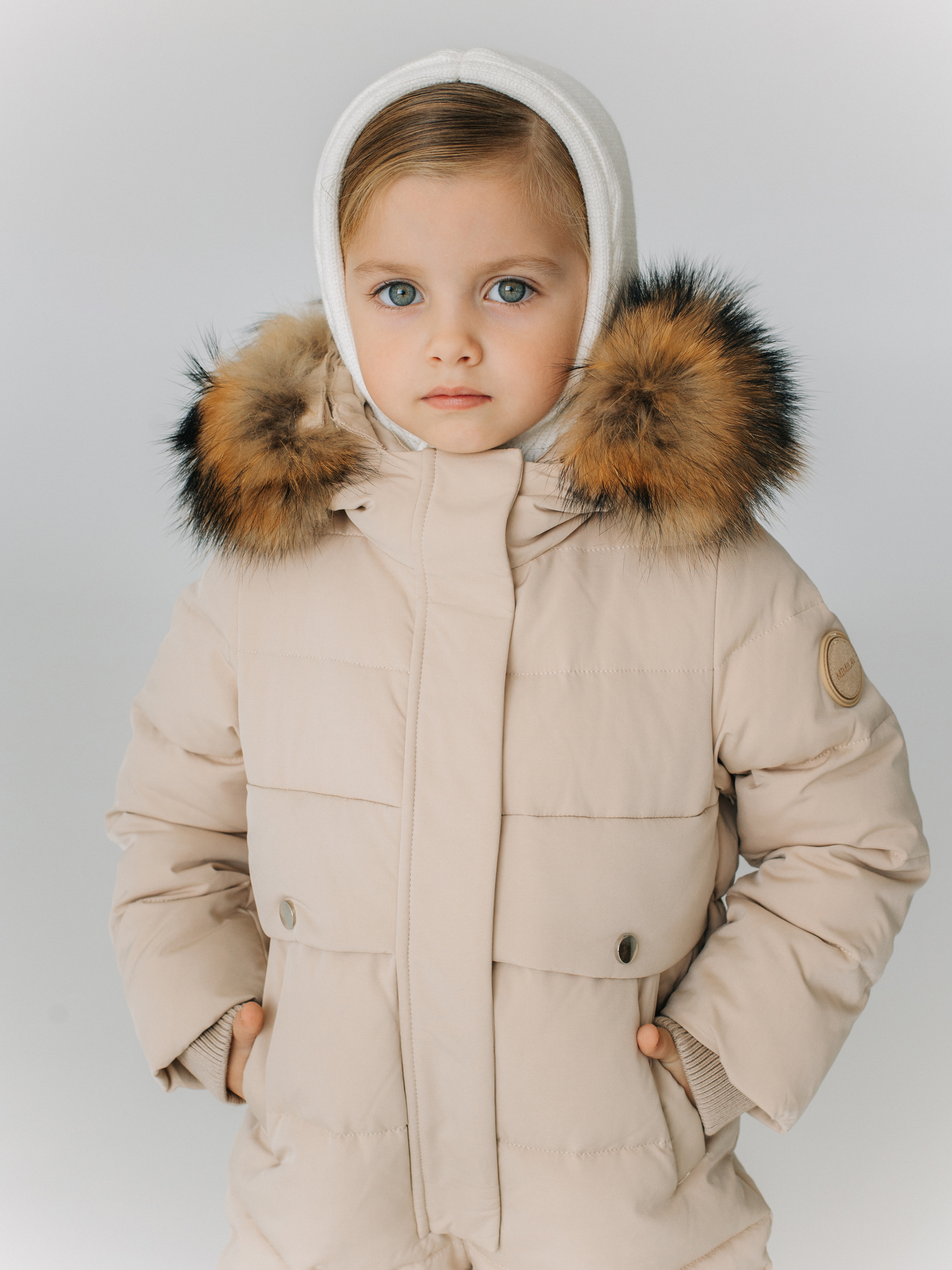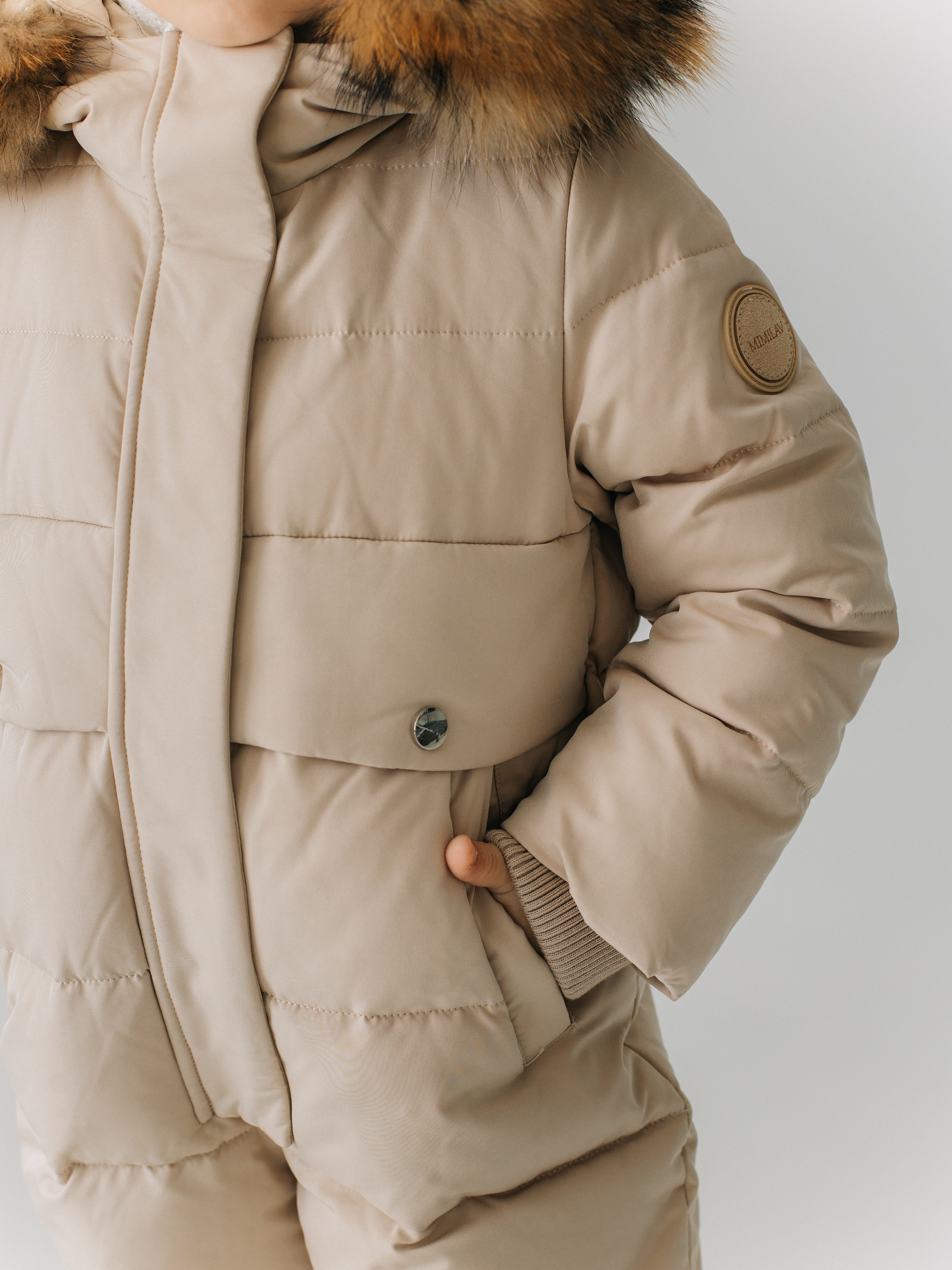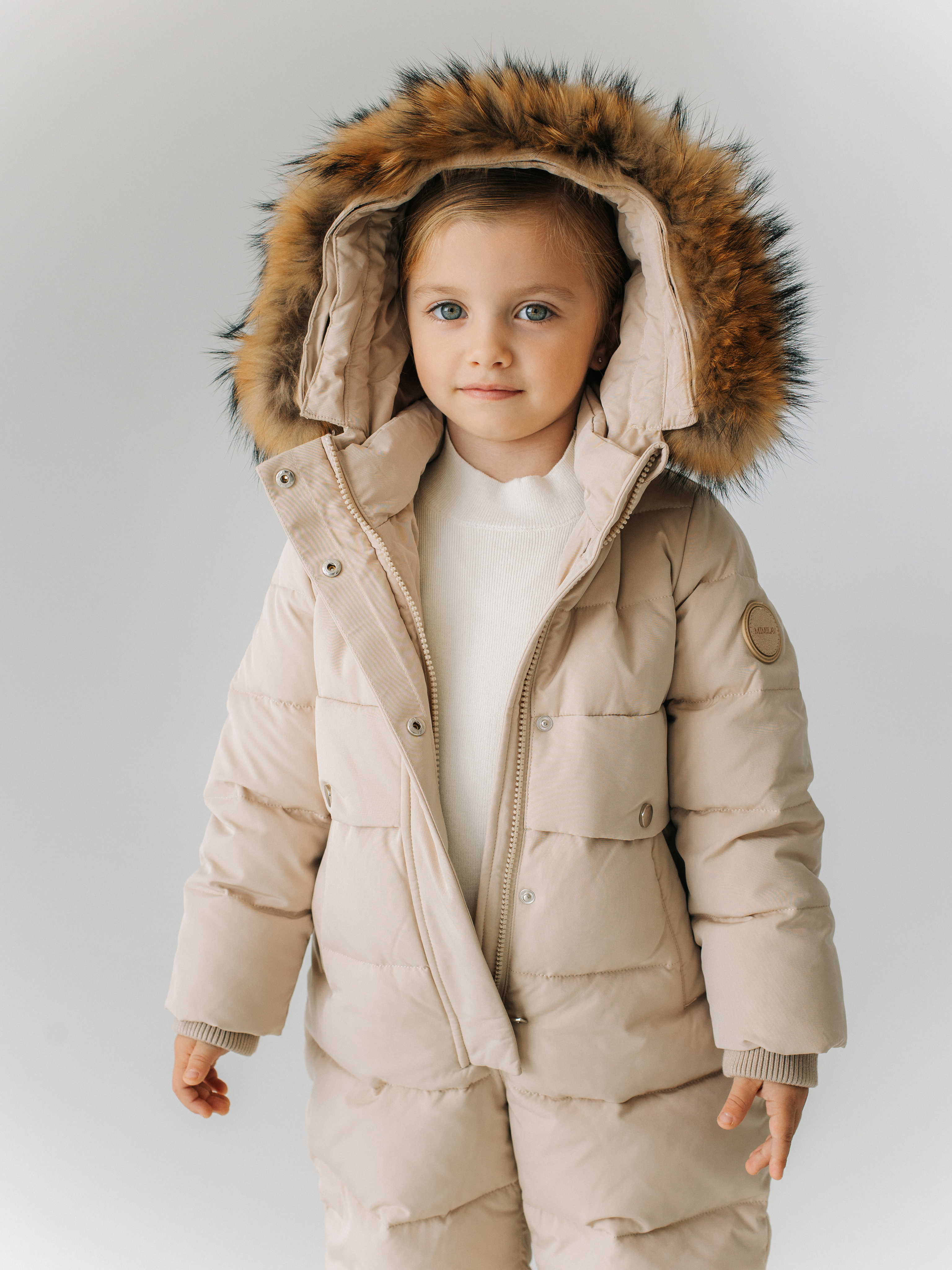 Зимний комбинезон из ветро и влагозащитной ткани. Капюшон вшитый со съемной опушкой из натурального меха. По низу рукавов и штанин эластичные манжеты на резинке.